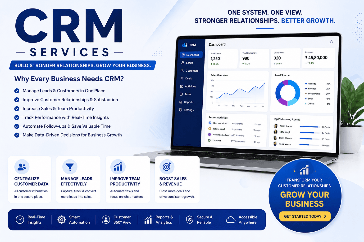 CRM (Customer Relationship Management) helps businesses manage leads, customers, sales, follow-ups, team performance, and business growth from one centralized system.