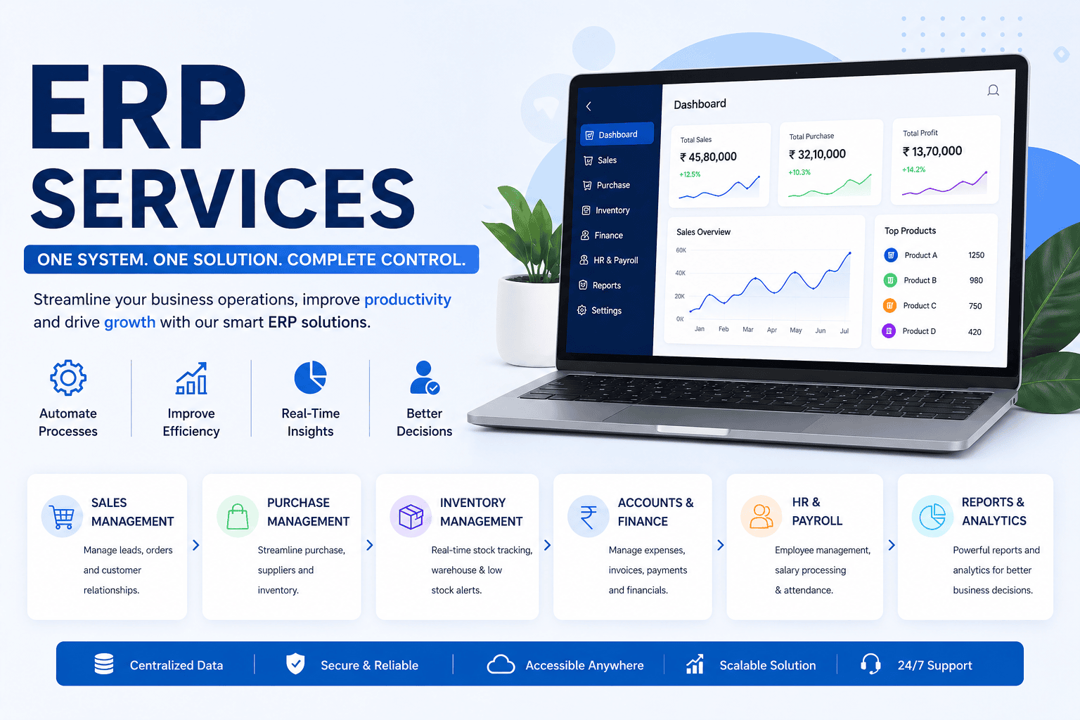 ERP (Enterprise Resource Planning) helps businesses manage all major operations like sales, inventory, accounts, HR, payroll, purchase, billing, reporting, and business processes from one centralized system.